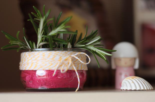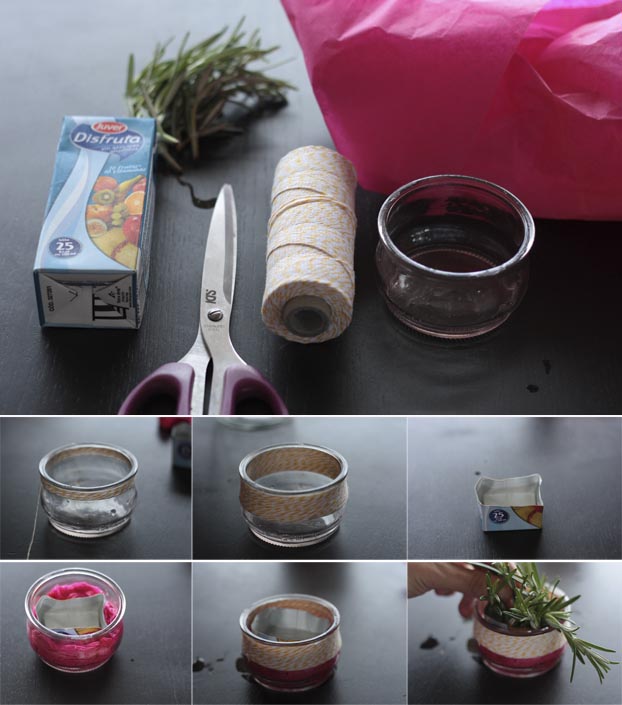 Como podéis ver en las imágenes los pasos son muy sencillos: 1. Enrollar el baker twine alrededor de la parte superior del envase de cristal 2. Recortar el envase de zumo 3. Meterlo dentro del de cristal 4. Rellenar los bordes con el papel cebolla 5. Colocar el romero.