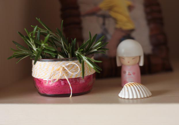 El primero que quería hacer era para el romero ¿Nos os encanta como huele? Para hacerlo utilizamos un recipiente de cristal tipo yogurt, papel cebolla fucsia, un envase de zumo, tijeras e hilo baker twine amarillo.