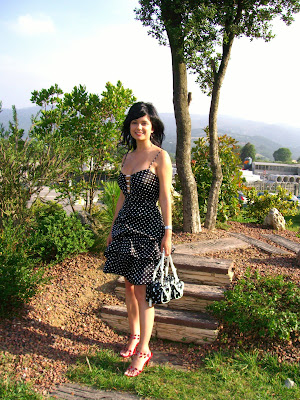 ¿No os gusta el vestido de cuerpo negro con fajin rojo y falda de lunares y flores?
