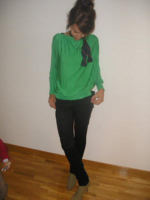 Este accesorio y los botines son las únicas novedades de un patrón repetido: look despeinado, pitillo negro H&M y camiseta verde Blanco.