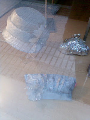 En el mismo escaparate tienen este vestido de organza en gris, para dar una idea a los complementos propuestos arriba, el vestido un poco serio para mí ..PEro me quedo sin dudarlo con el bolsito y el tocado-sombrero..