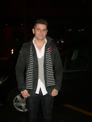 Este chico me llamó la atención por lo conjuntado que iba,a la vez que moderno. LLevaba pantalón vaquero en denim muy oscuro, con camisa blanca, chaqueta entalladita en gris, Cazadora negra con algún dibujillo en rojo ( levaba tambien cinturón rojo, pero no se aprecia en la foto..) todo ello de Zara.