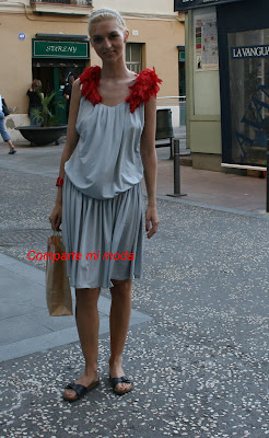 Este modelo, no apto para las mas clásicas, nos llamó la atención a pie de calle por la combinación de las plumas, la espalda al aire…Por supuesto pensamos que esta preciosa alemana luciría mas su modelín con ropa interior adecuada y unas bonitas sandalias. La diadema que llevaba -no se si podeis apreciarla ampliando la imagen- es una maravilla.