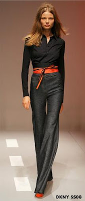 yo tengo un jersey fino naranja (mas coral que naranja), y queda genial con unos pantalones grises-plateados anchos, muy del estylo de la primera foto DKNY que has puesto