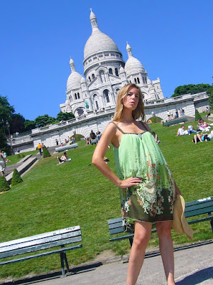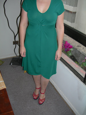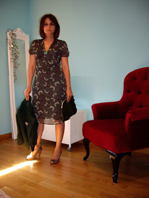 67: Vestido UNICEN.Chaqueta roja de ETAM. Bailarinas raso negro con lazo de LA CHOLA Cinta del pelo con lazo H&M. Shopping bag verde «Le fabuleux Montmartre»