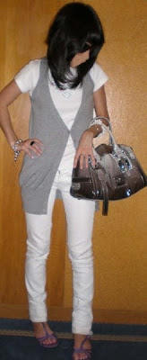6: me encanta este look, super sencillo pero precioso. Lós básicos blancos con el chaleco larguito gris genial, y las sandalias fucsia, de donde serán? preciosas