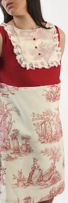 Dos vestidos en los que el rojo es de una u otra manera protagonista, el de la derecha, uno de los preferidos de Mónica, ya que considera parte de su esencia el eterno estampado «Toile de jouy». El de la izquierda un palabra de honor, fruncido por el pecho.