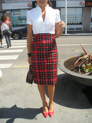 El caso es que paseando por Gijón durante el puente, nos encontramos con esta chica que llevaba una falda lapiz de cuadros escoceses y como este estampado ya campaba a sus anchas en nuestras retinas, no nos resistimos a pedirle una foto…