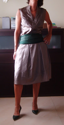A mí me parece que tiene que poner mucha atención a los complementos porque el conjunto es bastante informal y podría ponerse cualquier día (aunque la foto también puede ser que engañe) El fajín, zapatos, bolso y también algún complemento más, collar, por ejemplo, para darle un aire más festivo.