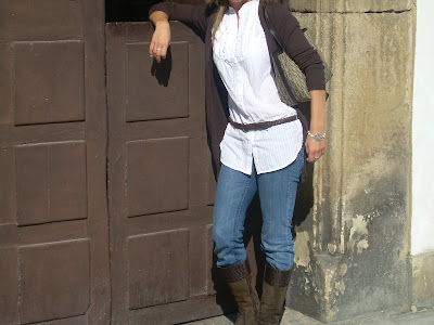 Chaqueta de punto marrón y camisa blanca larga con cinturón trenzado marrón -de manga corta- ambas de Stradivarius. Pantalón vaquero de Nolita, botas altas de Zara. Y en cuanto a los complementos creo que ya los conoceís : Bolso shopping de CH, pulsera de Tous.