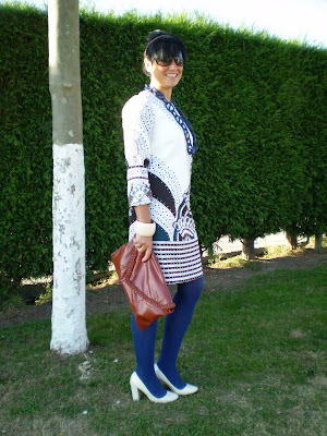 El look lady con un punto sesentero, lo pone el vestido de Mango coordinado con medias y collar en azulón, si os fijais la diadema trenzada coordina perfectamente con el bolso sobre