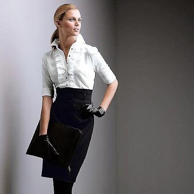 En la primera foto un look lady en blanco y negro. Me gustó porque parecen dos piezas y es un vestido, el largo de la manga los guantes… Creo que puede daros ideas para la oficina, actos institucionales como entrega de títulos o graduaciones … ¿ Os gusta?