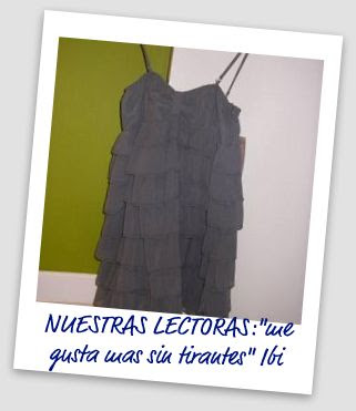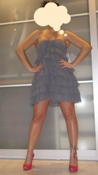 El vestido lo compró en Zara, es gris de volantes y tiene tirantes de quita y pon. Después de mucho probarlo como más le gustó fue sin ellos -escote palabra de honor- y asi lo llevará.