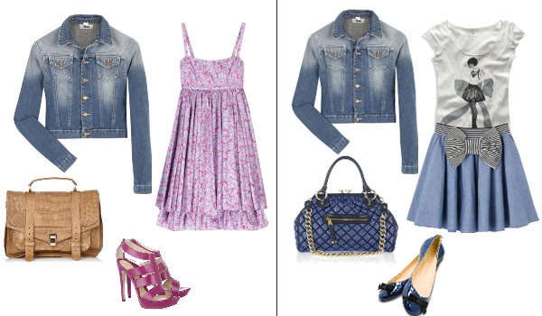 En cuanto a la pregunta del millón…¿Con que ponerla? La revista Woman nos enseña estos dos looks para combinar una misma chaqueta. Además de estas propuestas, a nosotras nos gustan con shorts o con vestido, o pantalón -no hace falta decir que no sea vaquero ¿verdad?- Realmente suele ser un error mas propio del público masculino eso de combinar lo vaquero con vaquero a nosotras nos horroriza, dos tonos de vaquero distinto se matan siempre!! por eso si la cazadora tiene un tono y nuestros jeans favoritos otro -imposible que sean iguales a no se q sea traje- no la pondríamos juntas. ¿ Manía? Puede ser…