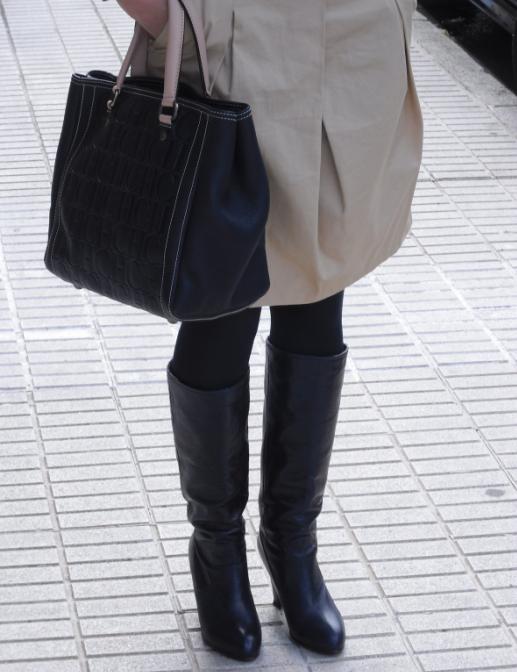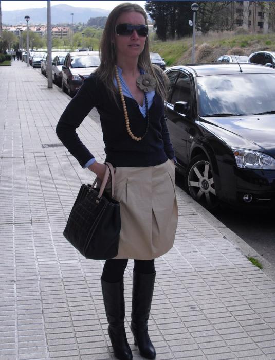 La falda beige es de blanco, un chollo que me compré en otoño por menos de diez euros. Las botas azul marino de caña alta son de Bimba y Lola, bolso andy de CH y medias marino de Calzedonia.