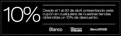A las que preguntabaís como va el tema del cupón de Blanco es este que hemos puesto en el post, podeís hacer click para ampliarlo e imprimiro.Con ese mismo se hará el descuento.Si teneis algun problema para hacerlo tb podeis conseguyirlo en su pagina web.