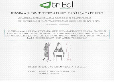 También el grupo Triball nos invita a una venta especial los días 5 – 6 y 7 de junio.. ¿Que nos podremos encontrar? Pues.. ropa de hombre, mujer , calzado y accesorios de otras temporadas. Los descuentos son muy interesantes todo al 50% y algunas cosas hasta el 70% ! y pensareis..¿Que marcas se pueden encontrar ? Nacionales : Alicia Rueda, Ailanto, Dolores Promesas, Amaya arzuaga , ..Internacionales: Givenchy , Celine, Tara jarmon , Paul y Joe sister, Marc Jacobs.. y muchos más.. Misma forma que kling solo teneis que imprimir esta invitación y presentaros en la dirección indicada de 11.00 a 21.00 ( viernes y sábado) o el domingo de 10.00a 14:00 horas.