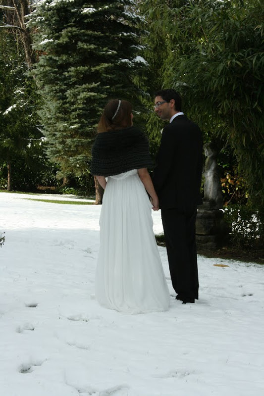 Ay Zoe, que guapísima estás, me gusta todo empezando por el pelo con la preciosa diadema , la estola, el vestido, el ramo y que dia mas maravilloso,para mi gusto el mejor que se podia tener en invierno:con nieve.Ahora sólo me queda daros la enhorabuena y que seais muy felices juntos.Un beso.