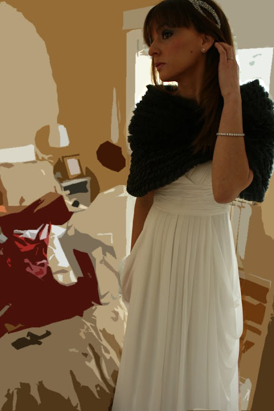 Un vestido con el que no me sintiera disfrazada y algún complemento que referenciara la estación elegida para la boda, fueron decisiones sencillas. El vestido ya os lo había enseñado en aquel post «investigaciones Bodiles», me decidí por Pronovias después de visitar tambien Rosa Clara y Josechu y por un vestido a mis ojos sencillo de corte romántico (podéis verlo tal cual en el link). La estola es de Adolfo Dominguez, buscaba la combinación de los colores gris-blanco y aunque me plateé una estola de pelo sintética cuando encontré esta no tuve dudas. Con la ayuda de Carmen la customicé un poquito, le pusimos el broche de plata que veis y le dimos unas puntadas interiores para que se asentara en el hombro ya que mi idea era llevarla ladeada como en la imagen.