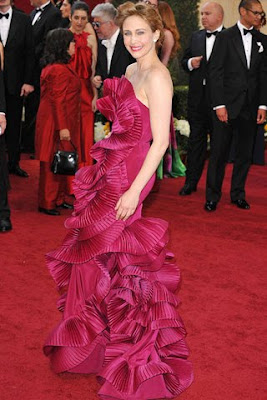 Como ya vaticinamos la semana pasada, los diseños de Marchesa inundaron la alfombra roja. Vera Farmiga, con este complicado vestido lleno de volantes.