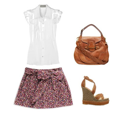 Para conseguir un termino medio os proponemos algunos looks con tendencias de la temporada fáciles de conseguir. Este con print floral, muy cómodo y sólo necesitamos combinar la falda con una blusa de manga corta blanca, ya sea básica o de estilo más romántico y unas sandalias de cuña, que la mayoría tendreís en vuestro armario de temporadas anteriores.