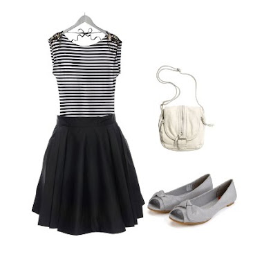 A estas alturas de la temporada, muchas tendreis una camiseta de estilo navy. Otra combinación muy simple y con mucho estilo, con una falda negra con vuelo y bailarinas.