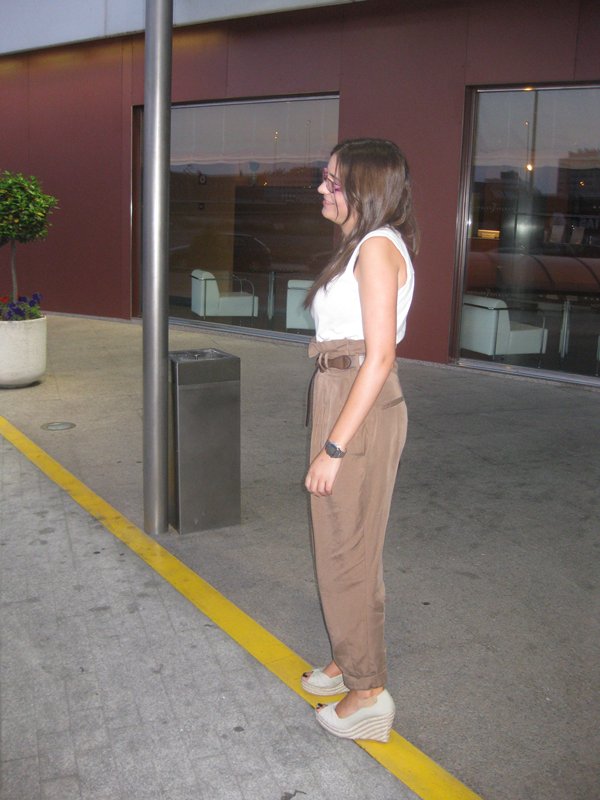 Me gusta el outfit! Pero aunque soy muy de cuñas, en este caso creo que un zapato de tacón habría quedado más acertado. De todas formas comprendo que se trata de «relajar» el look y por eso se han elegido.