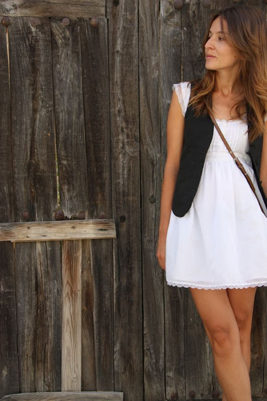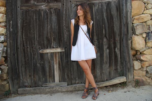 Vestido de Zara, Chaleco Vintage, Bolso y sandalias de Bimba y Lola.