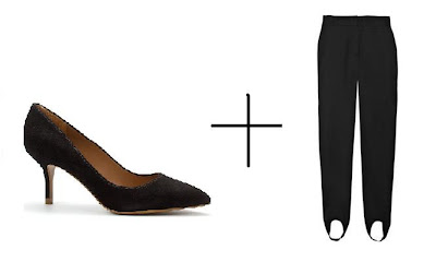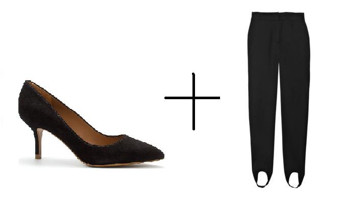 Para lograr un look similar buscaremos un zapato de punta de salón (en la tonalidad elejida) y en el caso de la imagen de la derecha un legging de talón.