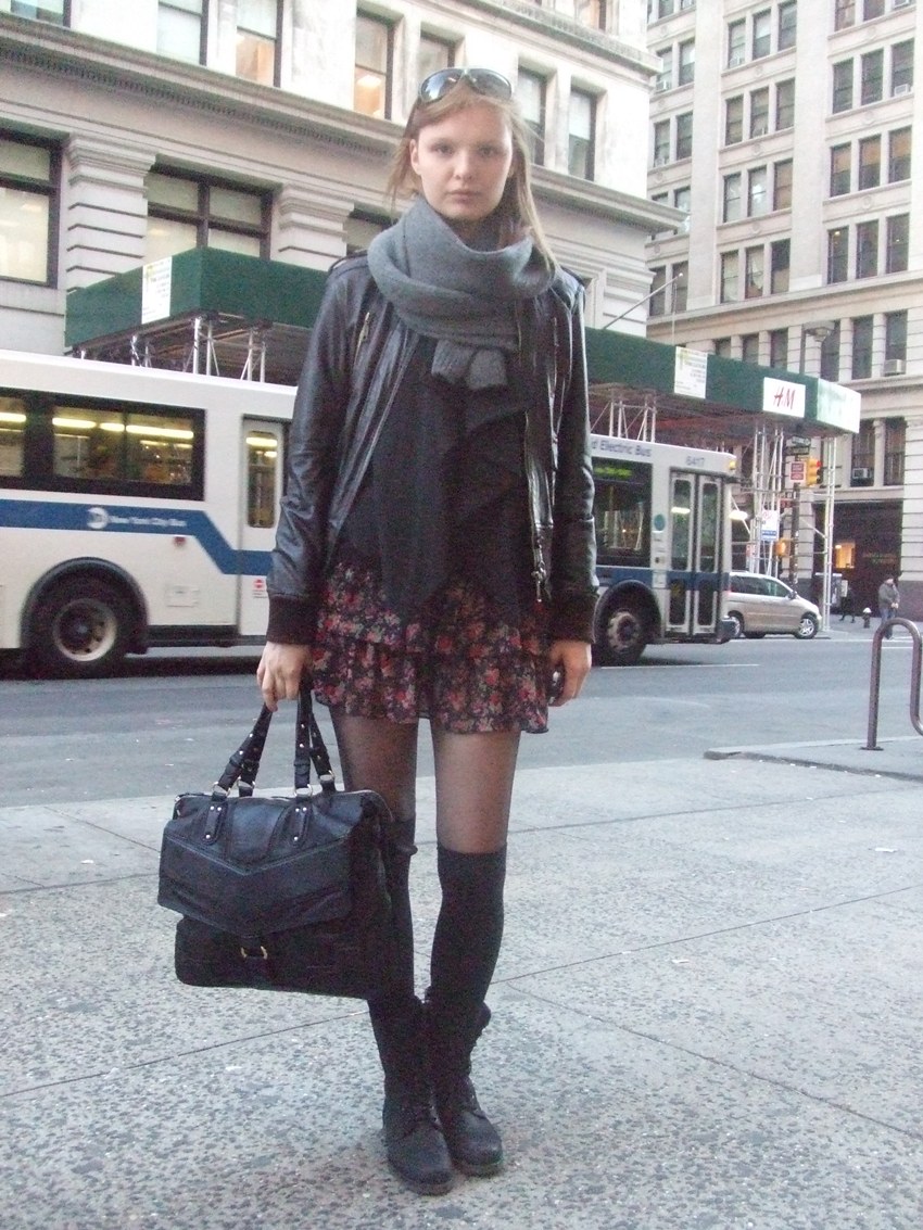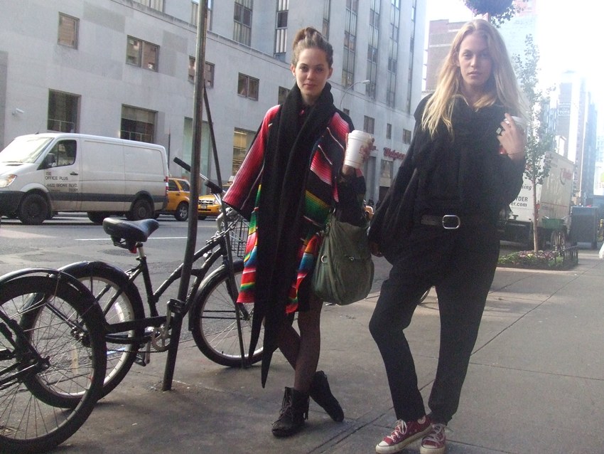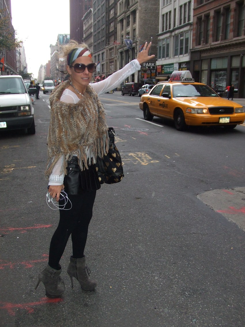 Ya durante el fin de semana, el look de esta chica, que intentaba parar un taxi cerca del edificio Flatiron, me llamó especialmente la atención. Creo que no me lo pondría nunca, pero es curiosa la cantidad de complementos y detalles que lleva: el bolso de corazones, la diadema, los botines con taconazo, la falda de cuero, el poncho de print animal… ¿Qué os parece a vosotras?