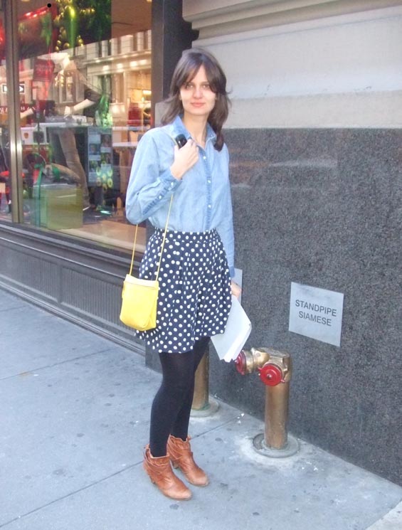 Un consejo, si queréis comprar los mejores libros de fotografía de Nueva York, no dejéis de visitar el Tenement Museum (cerca del metro Delancey Street). Allí conocí a esta ex modelo americana que ahora dirige una de las agencias de moda más importantes de la Gran Manzana. Me encanta el look desenfadado que lleva: camisa vaquera, faldita evasé de lunares y botines marrones con un poquito de tacón. Además, como podéis ver, ¡¡también lleva un bolsito mostaza!!