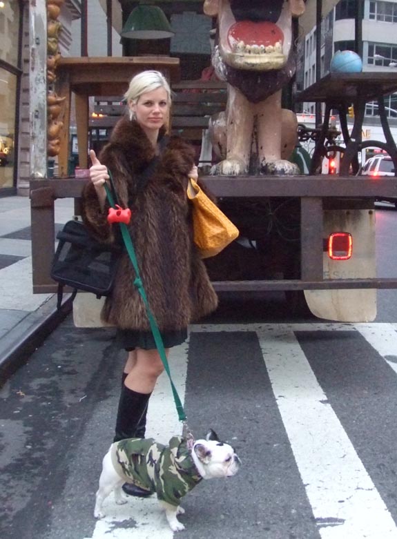 Otras, como esta guapísima modelo sueca, prefieren apostar por una de las tendencias clave de esta temporada: los chaquetones de pieles. Como complemento, un bolso mostaza –otro de los must have de los próximos meses- La acompañaun simpático bulldog francés llamado “Tren” vestido de camuflaje, una estampa curiosa, ¿no creéis?