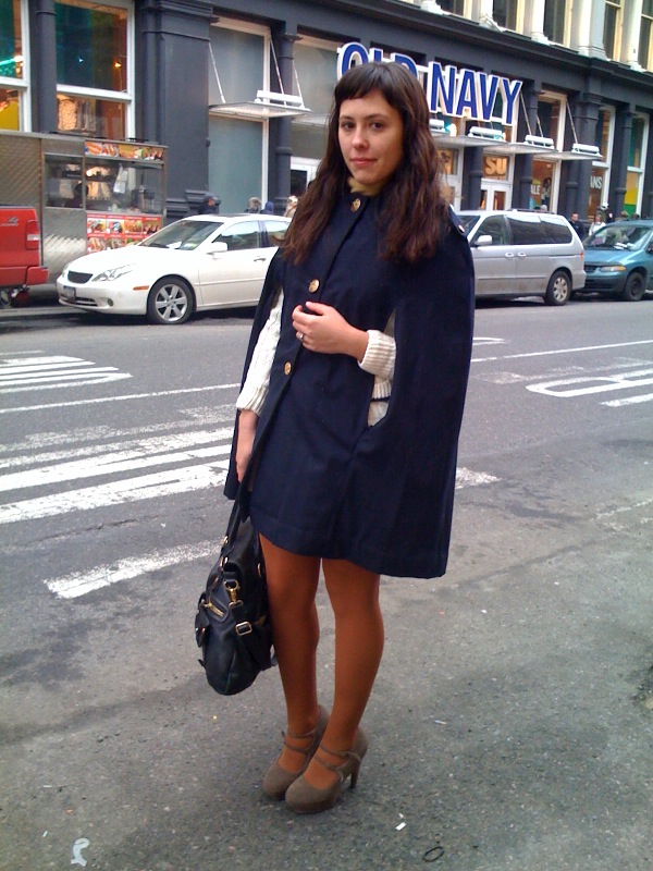 Otras, como esta neoyorkina que disfrutaba de una mañana de compras con un grupo de amigas, prefieren un estilo más preppy. Medias tupidas en color tostado, capa marinera extra-large y merceditas con taconazo y aire retro…No os recuerda a nadie este outfit? Seguro que más de una habréis pensado inmediatamente en Blair Waldorf al verla!! Sólo le falta una diadema con lazo en el lateral para ser igual que la ex estudiante de Constance, ¿no creéis?