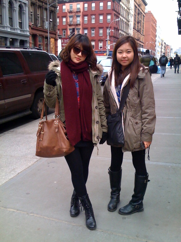 También de origen asiático, aunque recién llegadas de Taiwan, eran estas dos turistas que me encontré cerca de la calle 47. Las dos llevaban una de las prendas de esta temporada, las parkas militares, combinadas con leggings negros y botas. Un look sencillo pero muy estiloso y con un toque undeground, ¿no os parece?