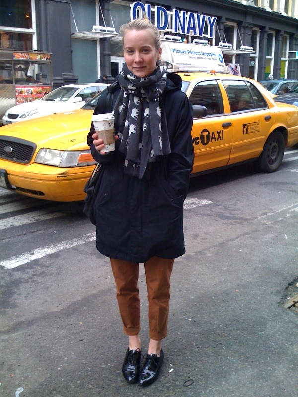 Aunque si de uniformes neoyorkinos se trata, el estilismo más demandado en la Gran Manzana últimamente es este: Zapatos Oxford sin calcetines, pantalones novilleros con aire masculino, abrigo en tonos oscuros (si puede ser negro, mejor) y café del Starbucks en la mano. No falla. Por cierto, la tienda que aparece detrás de fondo en la imagen, Old Navy, es una tienda de ropa que tiene descuentos increíbles todo el año. Podéis encontrar camisetas y tank tops desde 3 dólares y abrigos por menos de 60, una buena opción para conseguir las últimas tendencias a muy buen precio.