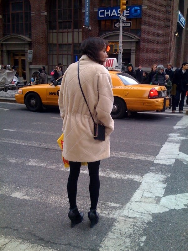 También con medias tupidas, aunque con zapatos de cuña negros y un precioso abrigo beige, iba esta elegante publicista de Queens. ¿No os encanta el bolsito bandolera que lleva?