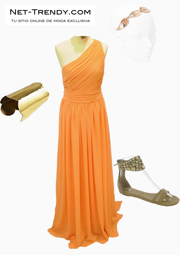 La preocupación de nuestras lectora es como ir adecuada sin parecer que lleva un disfraz. Para nosotras la calidad de las telas y los complementos marcará claramente esa diferencia, por lo demás existen gran variedad de vestidos de este estilo entre los que poder elegir. En Net- Trendy la tienda de moda online que os presentamos recientemente, encontramos este vestido firmado por Boüret Atelier. Nos parece pefecto para combinarlo con un tocado de Monic que combina dorado y mandarina y un brazalete Esther Amo en tono dorado. Como calzado hemos elegido unas sandalias planas en el mismo tono de los complementos.