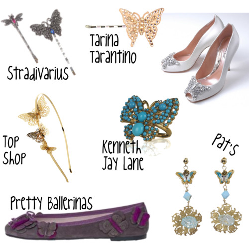 Aunque también podemos optar por utilizar mariposas en pequeños complementos para el pelo o joyas y como adorno en el calzado.