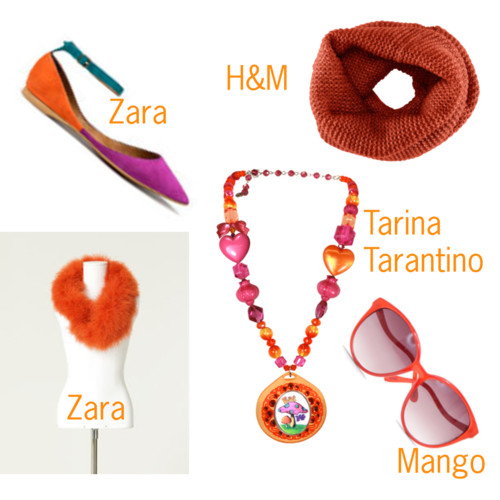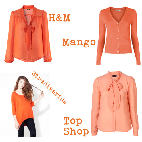 Todo de naranja a verdad es que no me atrevo pero en complementos si(tengo unas salones de Zara en naranja monisimos). De todos modos me quedaria con la camisa de H&M, es muy mona.