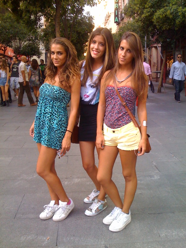 Y qué mejor que pasear por las calles de Madrid en una veraniega tarde de septiembre para disfrutar los últimos días del estío en la capital. Eso mismo pensaron estas tres jóvenes turistas portuguesas que viajaron a Madrid la semana pasada para disfrutar de la Vogue Fashion Night Out. Print de leopardo en turquesa, tank top blanco con minifalda negra o camiseta liberty con shorts amarillos, todo vale para hacer turismo por las calles más castizas.
