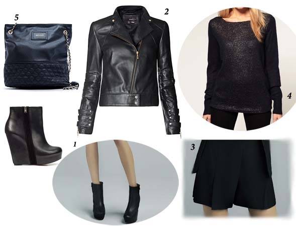 Esta semana nos fijamos en un look que probablemente la mayoría podremos componer con prendas que tenemos en el armario: Jersey gordito, la mítica cazadora de cuero, mini falda (un short anchito también nos puede servir), bolso grande y botines, que ayudan a dar fuerza al look.