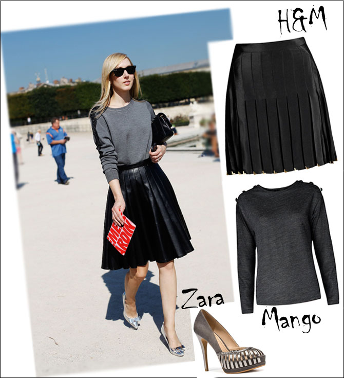 Hace tiempo que guardo esta imagen, me gusta la combinación de la falda de tablas aparentemente de piel con un sencillo jersey gris de algodón.