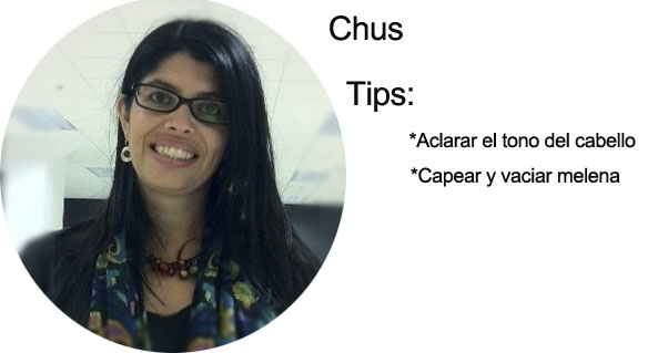 Le aconsejo a Chus que se aclare un poco el cabello, un tono mas avellana estaría bien para dar luminosidad al rostro y resaltar su mirada. En cuanto al corte deberia darle mas forma a su melena escalándola y vaciándola un poco. Estas son algunas imágenes que le podrías llevar a tu peluquero…