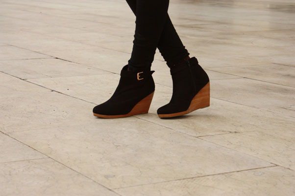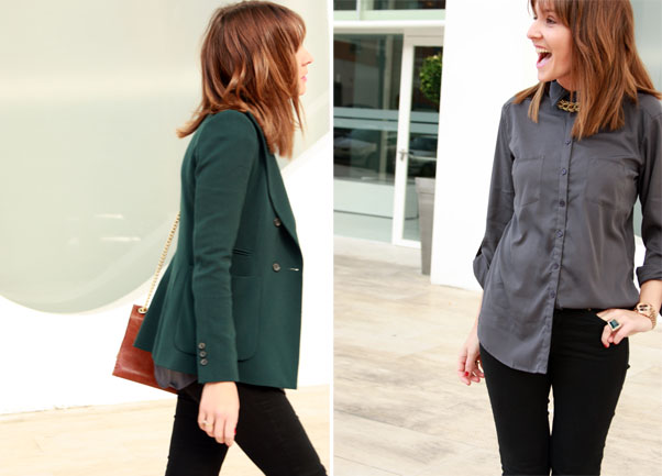 Camisa gris azulada, pitillo negro un par de básicos en mi armario a los que he añadido las cuñas de H&M que ya os he enseñado (cómodas y muy combinables) y la blazer verde que ya habéis visto alguna vez.