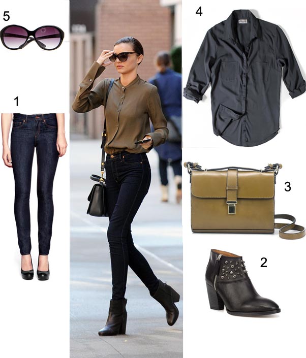 1 Pantalón ultra slim de H&M(19,95€) 2.3 Bolso y botines Zara 4. Camisa Pull and Bear (9,99 también la hay en el color que lleva miranda) 5. Gafas de Mango (17,99€).