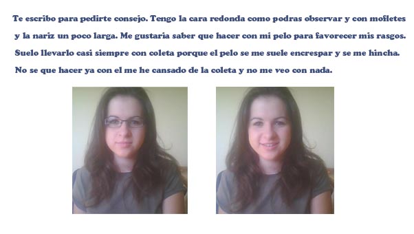 «Como ella misma dice tiene el rostro redondo, en este tipo de rostro es mas favorecedor el cabello liso que rizado. Los Cortes deben ser desfilados y cubrir los pómulos. El flequillo mejor ladeado que recto. Para solucionar el tema del encrespamiento basta con usar un acondicionador en spray que no necesite aclarado justo antes de secarse el pelo. Como toque final, después del secador o plancha, debe poner un poco de cera, así evitará el encrespado.