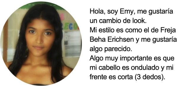 «La consulta de Emy me ha llamado la atención en cuanto a las referencias que nos da. No podemos tomar como referencia a la top model que comenta porque no tiene su mismo tipo de rostro. Y respecto a su frente pequeña tampoco voy a hacer hincapié en ella puesto que a mi no me parece que su frente sea corta, simplemente tiene el rostro pequeño, pero totalmente armonioso, y unas facciones muy bonitas.