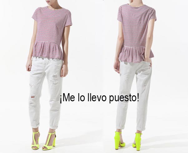Si os acordáis cuando hablamos de las prendas péplum una de nuestras maneras favoritas de llevar este estilo de camisetas, era con boyfriend trousers. Parece que Zara está de acuerdo con nosotras y propone un estilismo similar tal y como refleja la imagen. La camiseta la tenéis también en color azul, y si el modelo de pantalón no os termina de convencer pero os gusta la idea de los rotos, en Berskha tenéis la versión «slim» con cortes muy logrados.