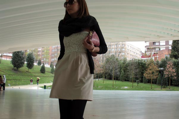 Para este día lluvioso, decidí combinarlo contrastándolo con negro. Como hacía frío y sobre todo el conjunto llevaba un abrigo, utilicé una rebeca sencillita y una bufanda aunque puede que mi forma favorita para llevarlo sea con cazadora de cuero negra.