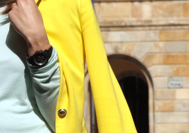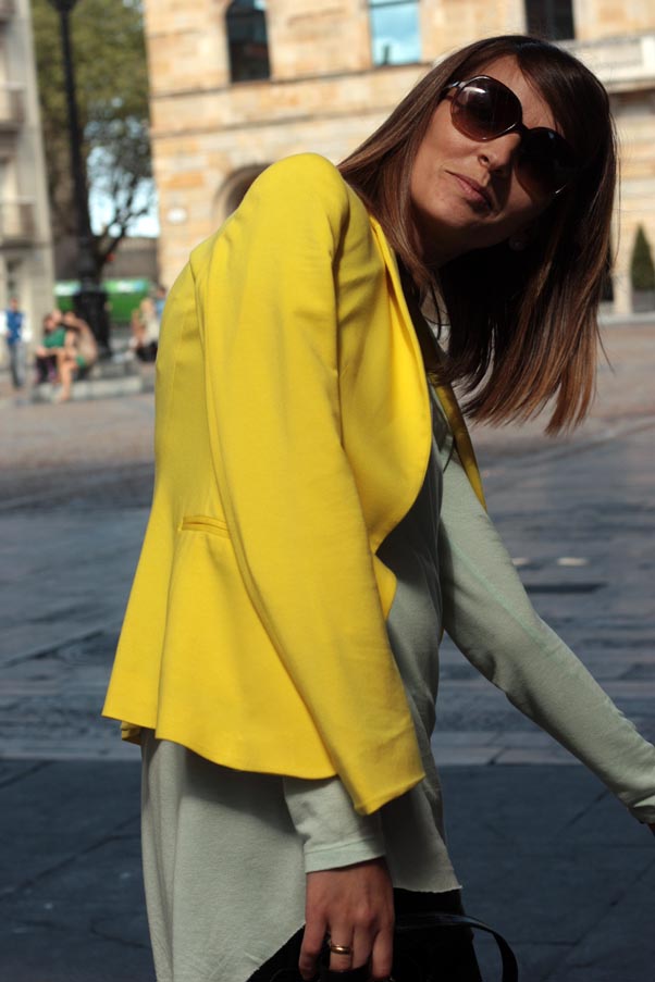 En esta época en que Ariadna es un terremoto que no para y quiere llevarme con ella allí donde va, este es el resultado. Espero que a pesar de no ser fotos al uso, os guste el look de hoy. Después de tantas horas de lluvia fue ver un rayo de sol y buscar en mi armario las prendas mas coloristas. Desde luego el amarillo no es un color de medias tintas pero como os decía en twitter allá por las vacaciones de Pascua ¡paso de refranes populares! Me encanta esta chaqueta amarilla que anima al instante cualquier look.